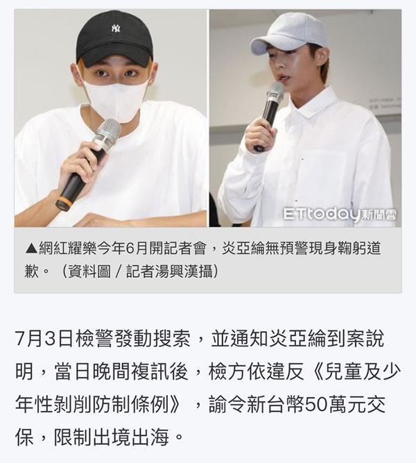 #炎亚纶涉嫌性剥削被起诉# 据台媒,炎亚纶日前遭网红邱耀乐爆料,炎在交往期间性侵还偷拍不雅照,当时邱耀乐未成年。事后炎亚纶出面道歉,谕令50万交保。并限制出境、出海。